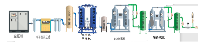 由于空气含一定水和油蒸汽,经过压缩机后,如果不经严格空气净化处理,油蒸汽容易被碳分子筛所吸附,并难以脱附,填塞分子筛孔径,导致分子筛“中毒”失效。所以在压缩空气进入吸附塔前设置严格空气净化装置,是保证分子筛使用寿命必不可少的一环。水对分子筛来讲虽然不是致命的,但会使分子筛吸附“负荷”增加,即影响其吸附O2、CO2之能力,因此压缩空气干燥除水,是提高分子筛吸附能力和稳定不可忽视的问题。
